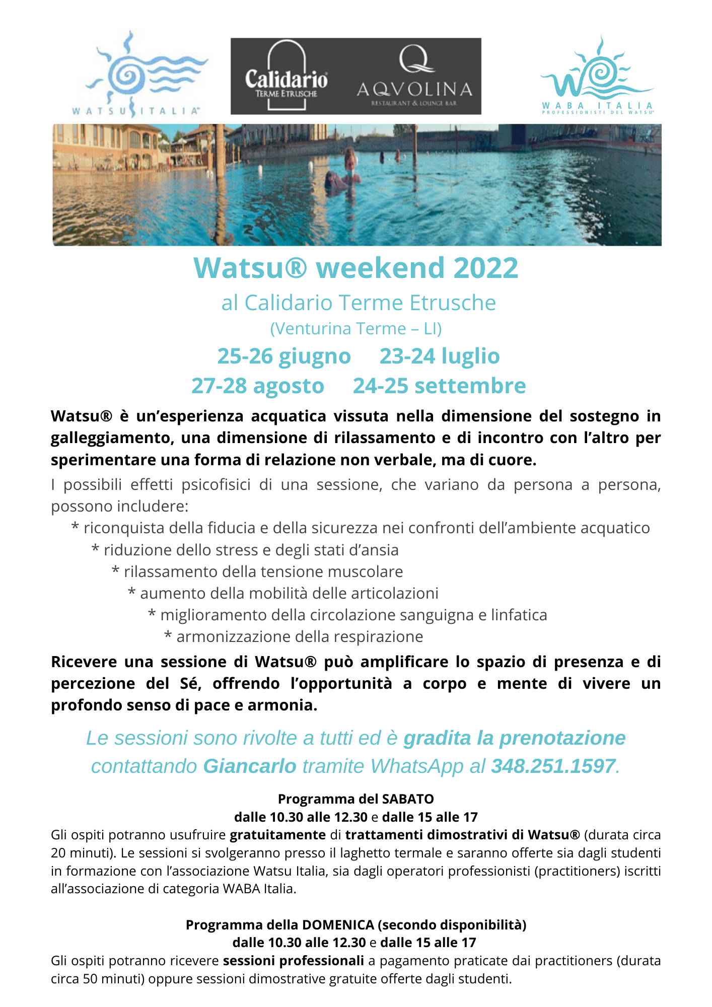 From June to September 2022, according to the calendar in the flyer and weather conditions permitting, Calidario Terme Etrusche www.calidario.it and Watsu Italia are organizing 4 weekends dedicated to introductory Watsu®!
